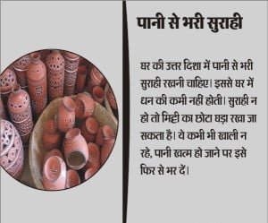 पानी से भरी सुराही – घर की उत्तर दिशा में पानी से भरी सुराही रखनी चाहिए। इससे घर में धन की कमी नहीं होती। सुराही न हो तो मिटटी का छोटा घड़ा रखा जा सकता हैं। ये कभी भी खाली न रहे, पानी ख़त्म हो जाने पर इसे फिर से भर दें।